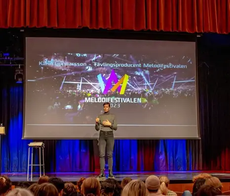 Eleverna fick ta del av föreläsningen som visade vilken stor bredd inom medieproduktion melodifestivalen faktiskt är. Arbetet bakom scenen och innan a...