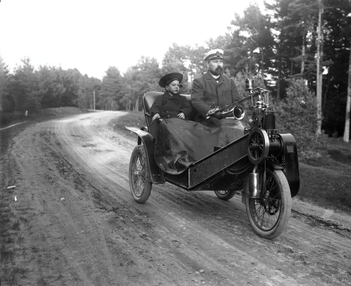 Fotografen Werner Lindhe och sonen Arne är ute och åker på sin trehjuliga cyklonette. Werner väckte troligtvis mycket uppståndelse när han körde genom Lidköping med cyklonetten, som tros vara ett av det allra första motordrivna fordonen i staden.