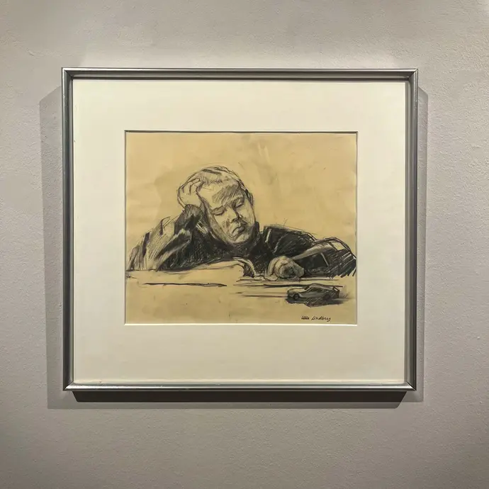 I den här teckningen möter vi en ung pojke som sitter lutad över ett bord, som sömnigt men plikttroget läser boken som han har framför sig. Lindberg kallar pojken vid namn, vilket antyder en personlig anknytning. Kanske är detta ett intimt familjeporträtt, en förtrolig skildring av en son som just tagit steget in i skolåldern. I förgrunden ger sig en leksaksbil till känna, en symbol för barndomen som kontrasterar mot den nyblivna skolpojkens nya åligganden.