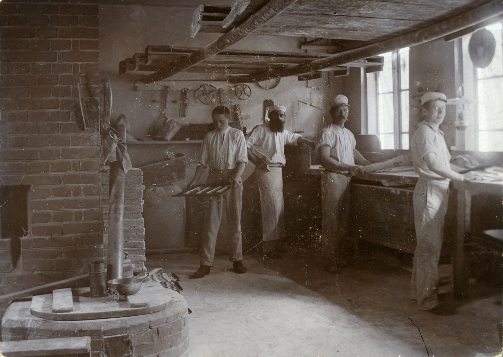 Doughs are left to rise and the baking ovens are warm at Westerståhl’s bakery at Skaragatan 4, around the year 1900. The man with the big beard is the baker himself, Georg Westerståhl. His son August Georg is seen with the baking tray. Baker Westerståhl arrived in Lidköping in 1888, leaving his native town Sala behind. Photographer: Gustav Simon Ander.