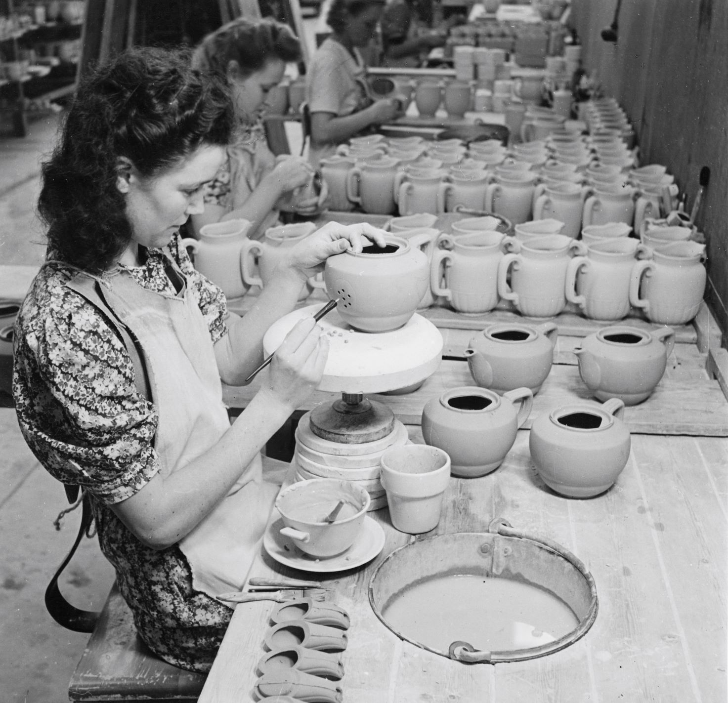 Arbete i full gång på Rörstrands porslinsfabrik år 1947. De gjutna föremålen behöver putsas och dekoreras. Öron och pipor på koppar och kannor ska fasthänklas. Fotograf: Arne Wahlberg. Fotografiet tillhör Tekniska museets samlingar.