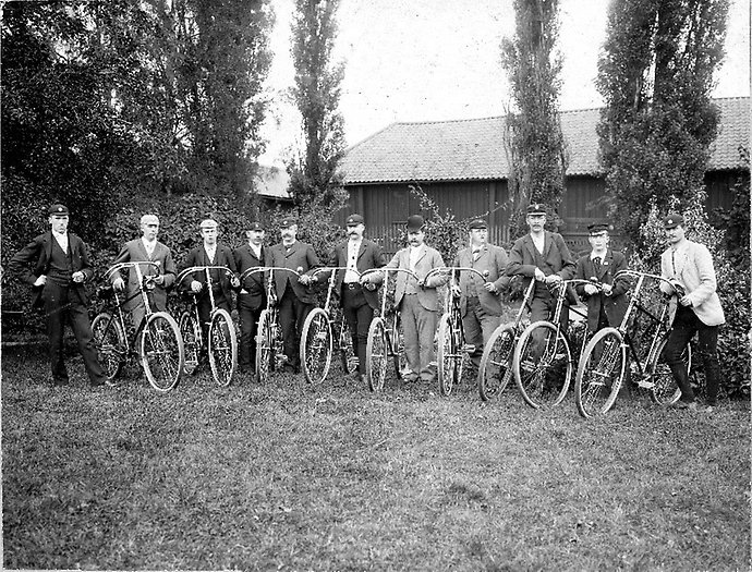 En samling stolta medlemmar av Lidköpings Velocipedklubb på utflykt i Schougska trädgården år 1894. De fotograferas av hovfotograf Werner Lindhe. Fjärde man från vänster: handlaren Gustaf Lindhe, nr 7: Anton Norén, nr 8 Gustaf Falkengren.